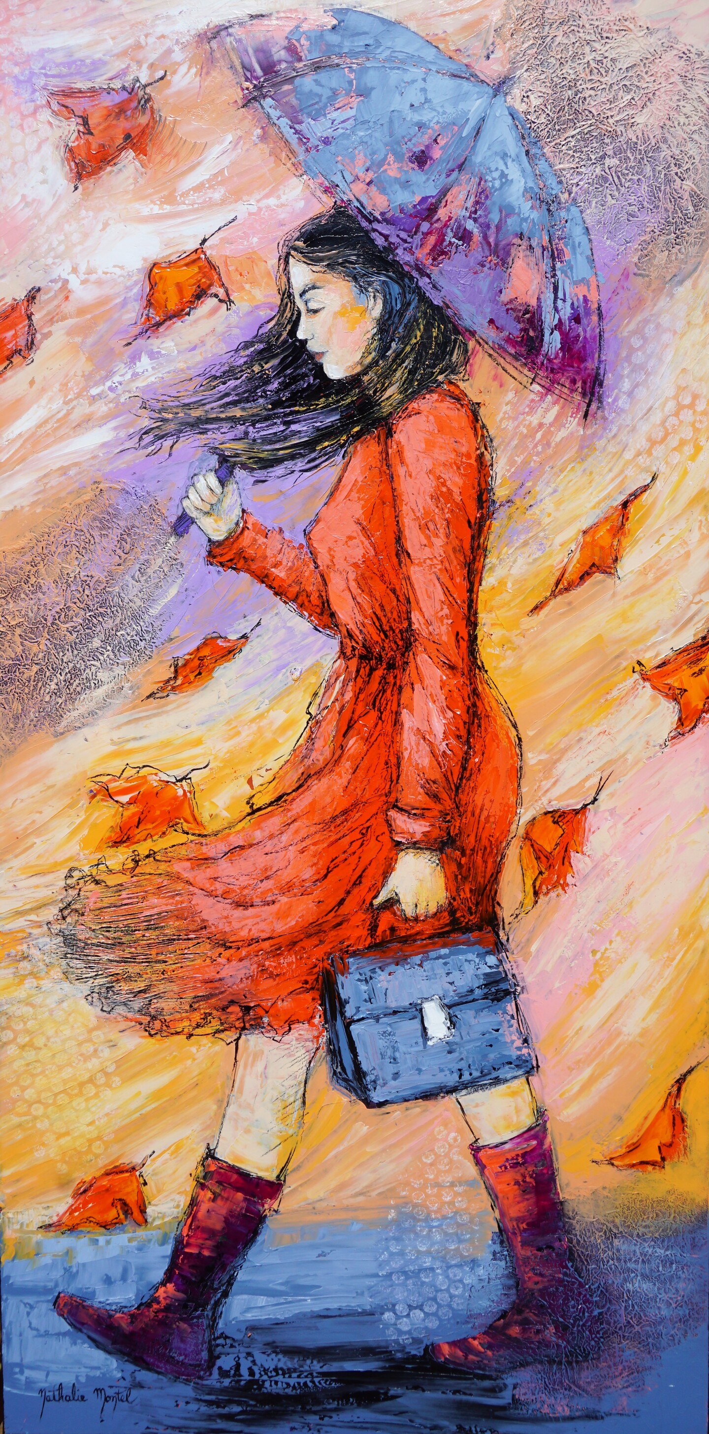 Un jeune femme qui marche avec un parapluie, cheveux au vent et robe qui s'envole à cause du vent .Des feuilles tourbillonnent autour d'elle