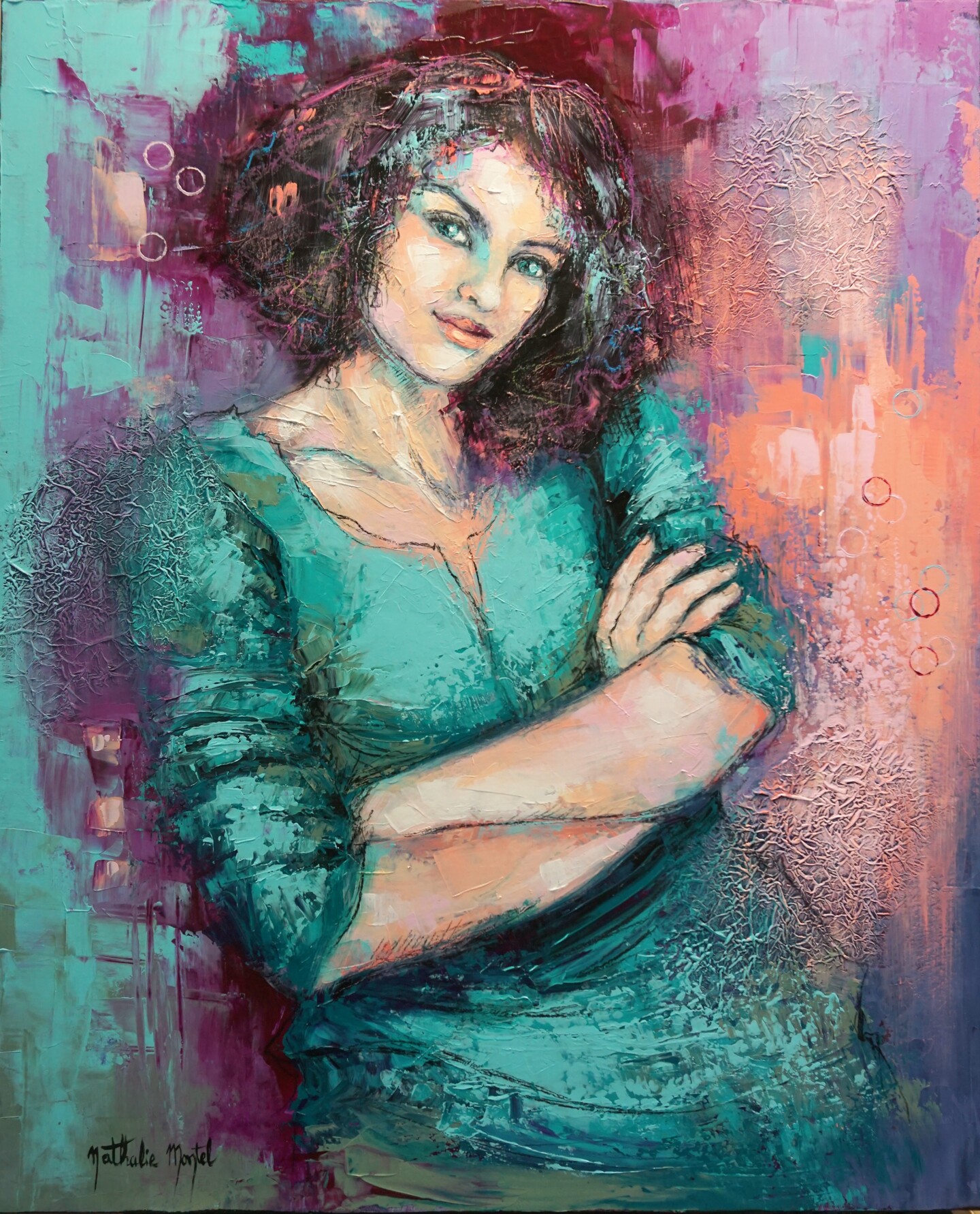 Une femme légèrement déhanchée les bras croisés qui semble interrogée le spectateur. Un regard et un sourire énigmatique
