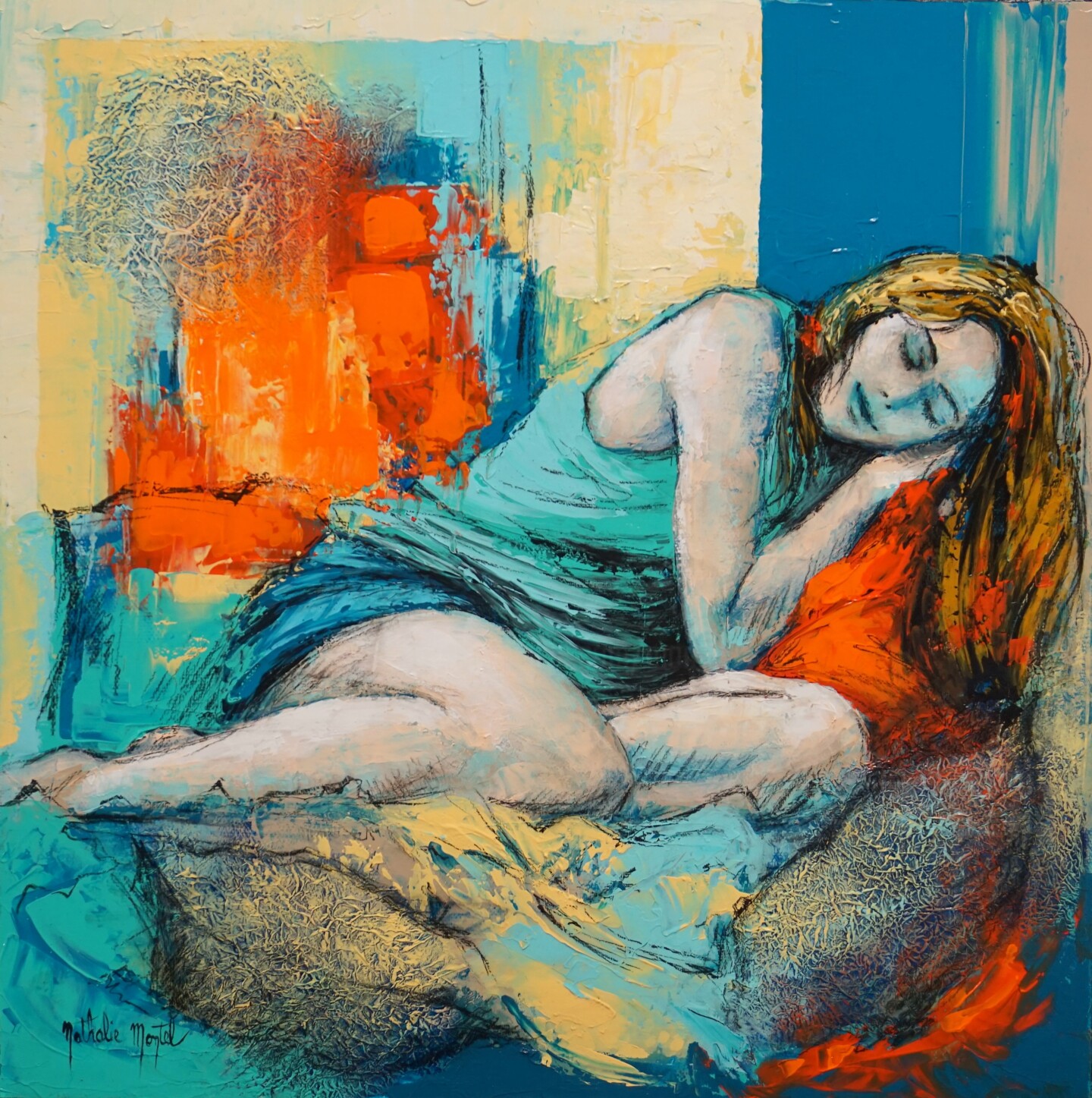 Dans une composition semi abstraite. On voit une jeune femme qui s'endort juste un instant.