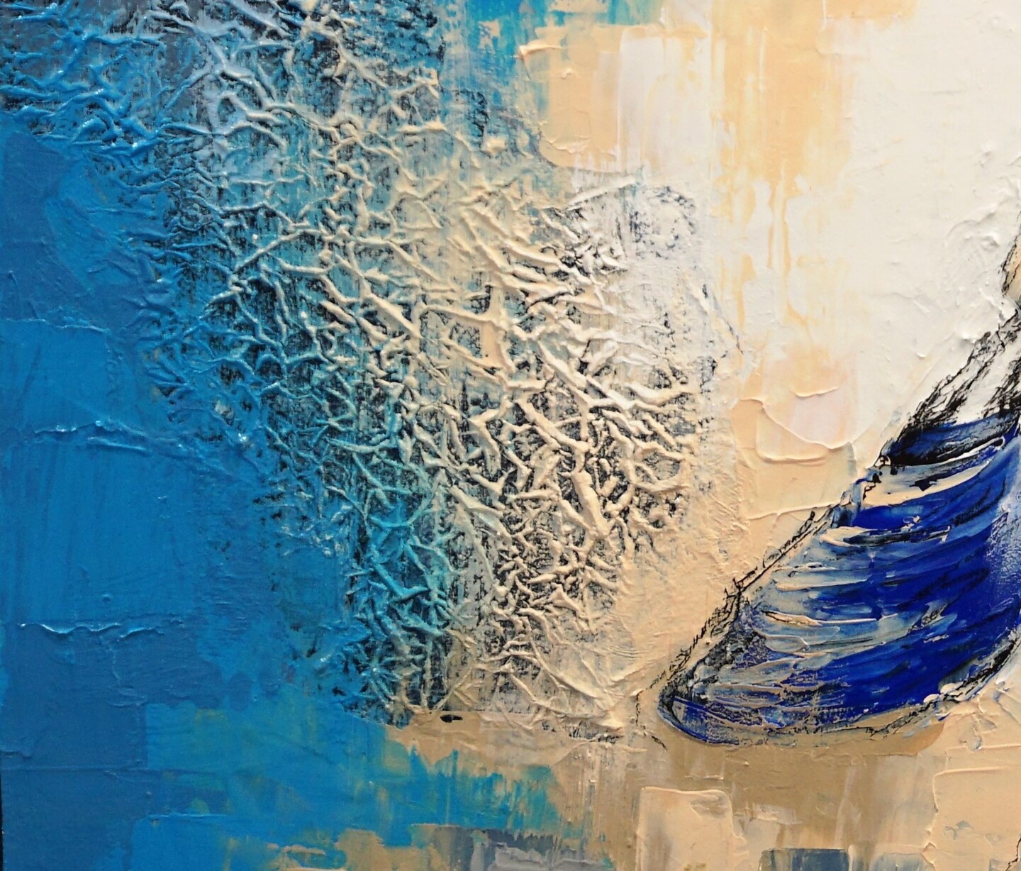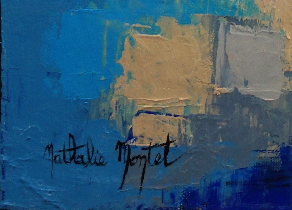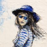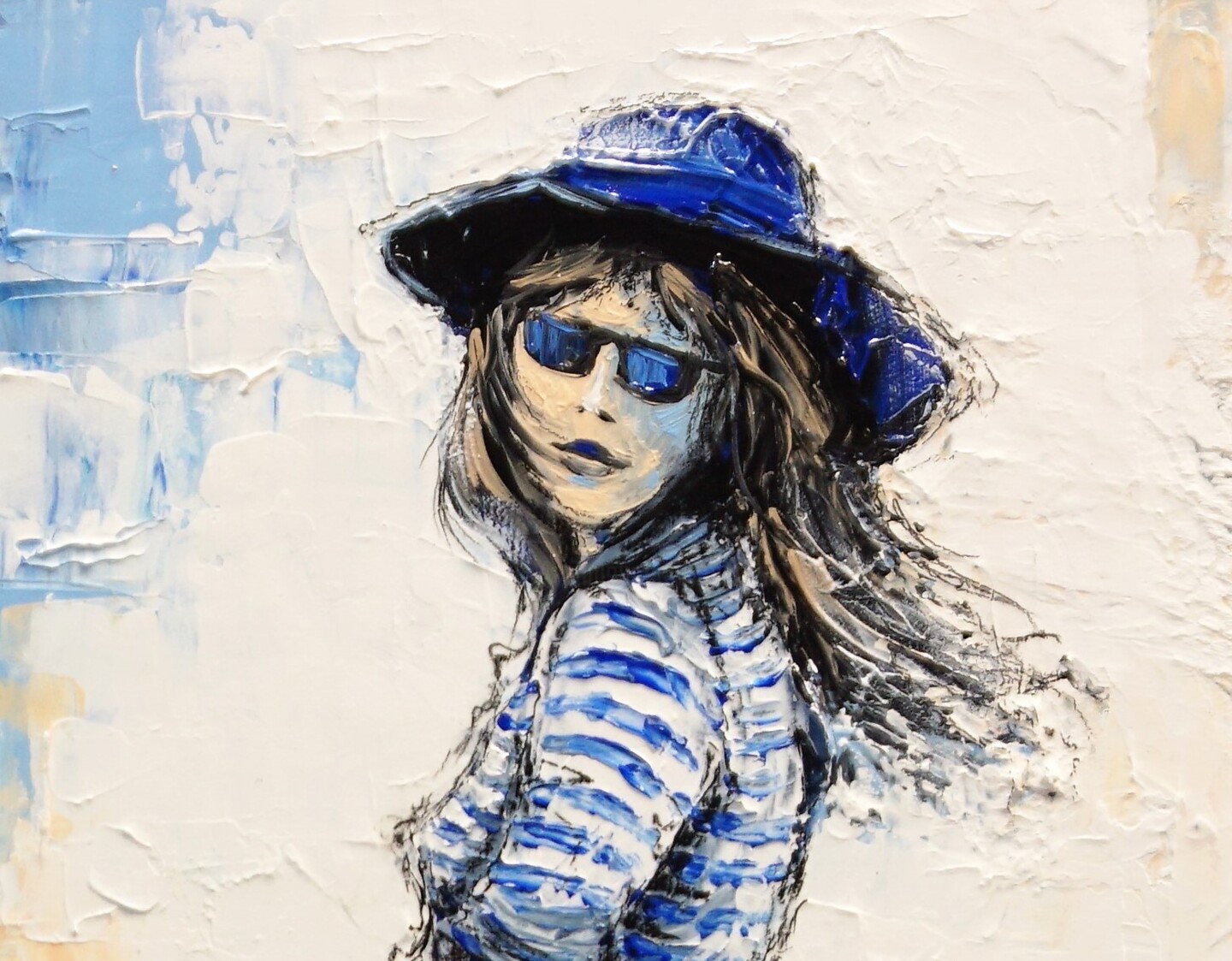 La peinture représente une jeune femme portant un chapeau ,des lunettes de soleil , un pull marin et un sac à main. Derrière la jeune femme une grande lumière vient la faire apparaitre , le mouvement dans le tableau est accentué par le déhanché ,les cheveux au vent et le sac qui se balance , le tout dans une harmonie de bleu qui amène de la sérénité.