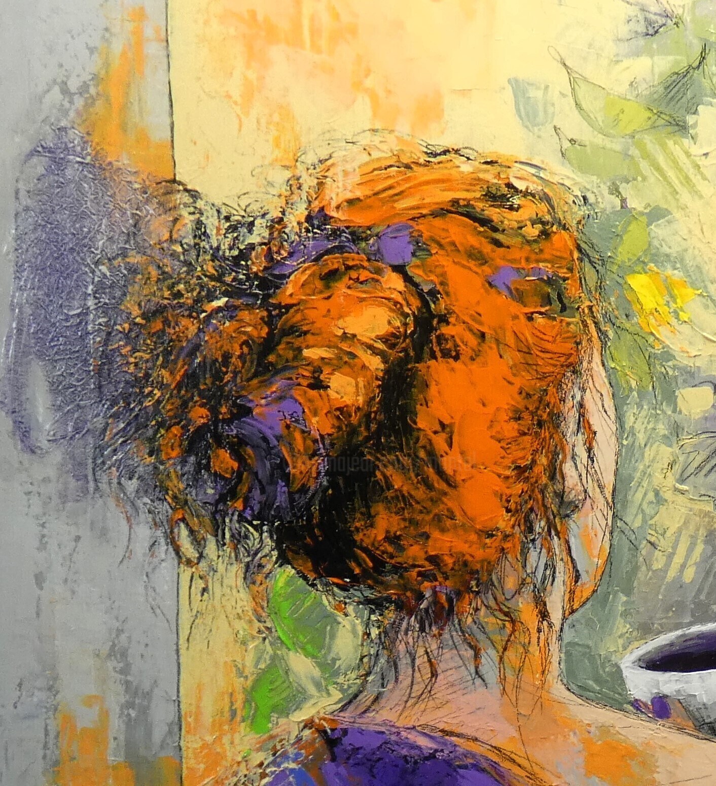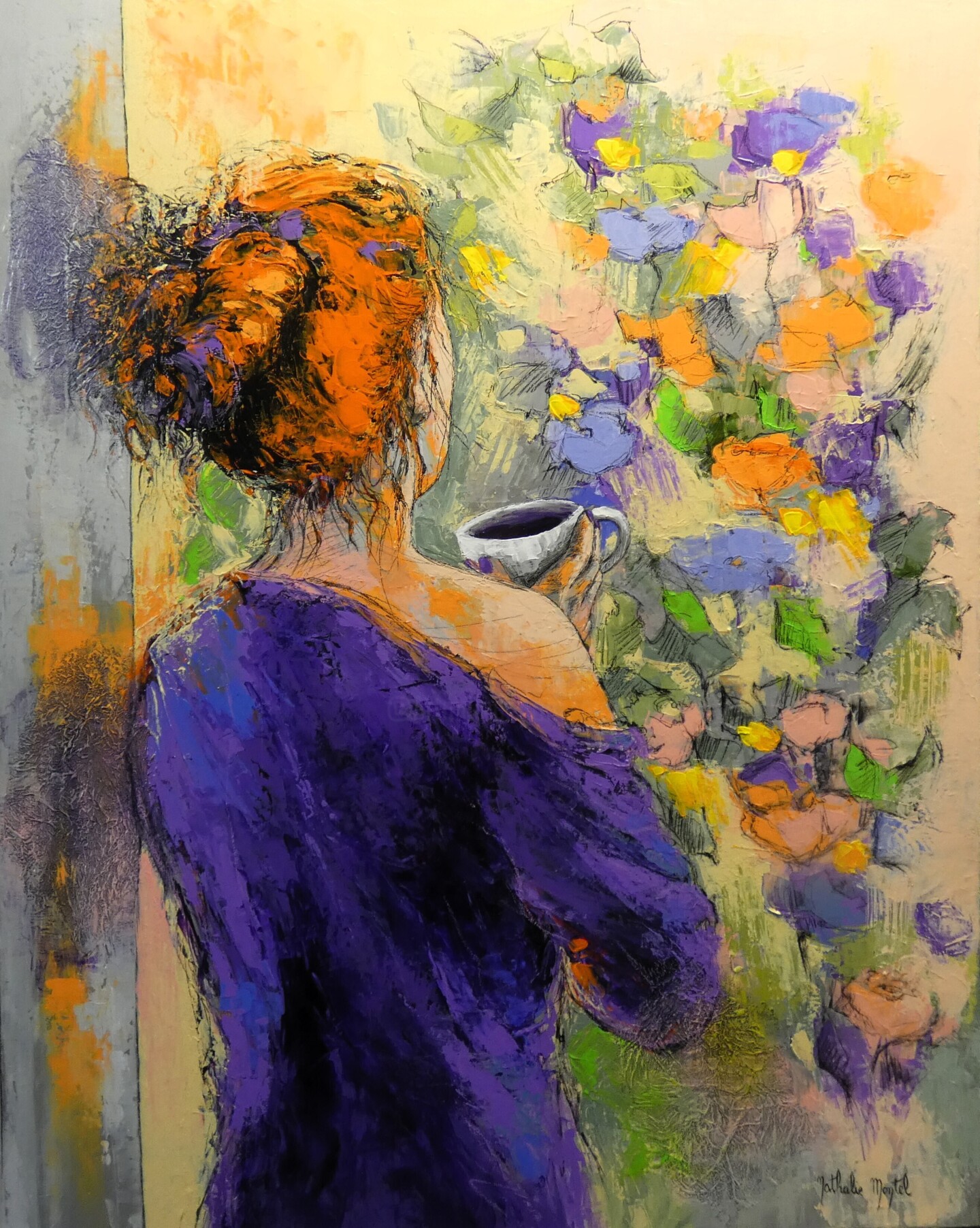 De bon matin ,une jeune femme les cheveux en bataille ,une tasse de café à la main, le regard vers l'extérieur pour admirer la floraison du printemps. Un moment de bonheur où l'on voudrait que le temps s'arrête, un instant suspendu! Contemplation matinale.