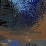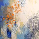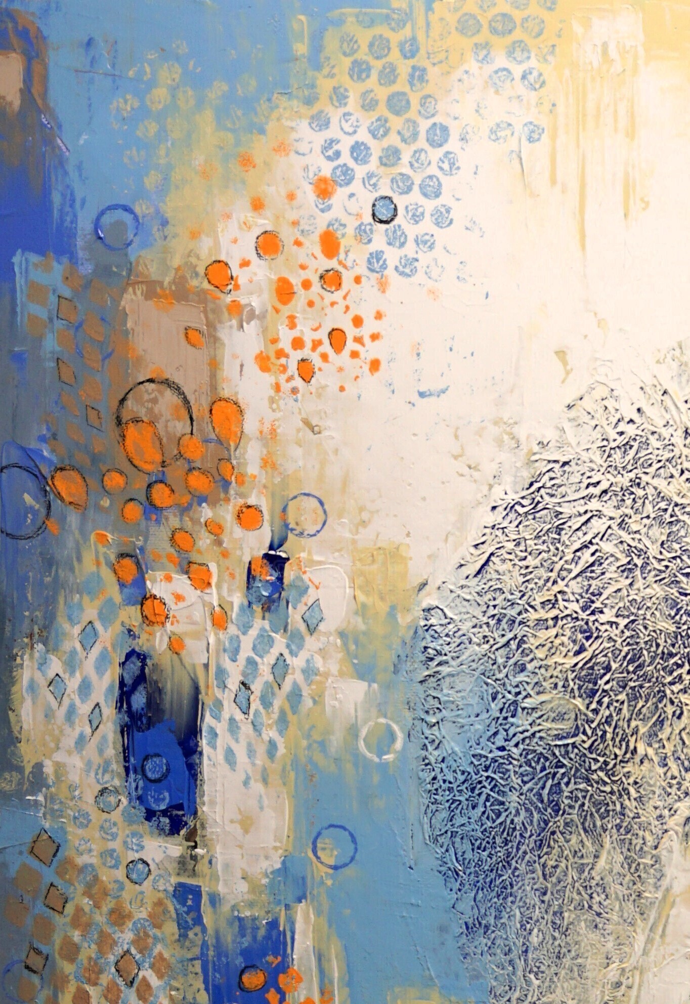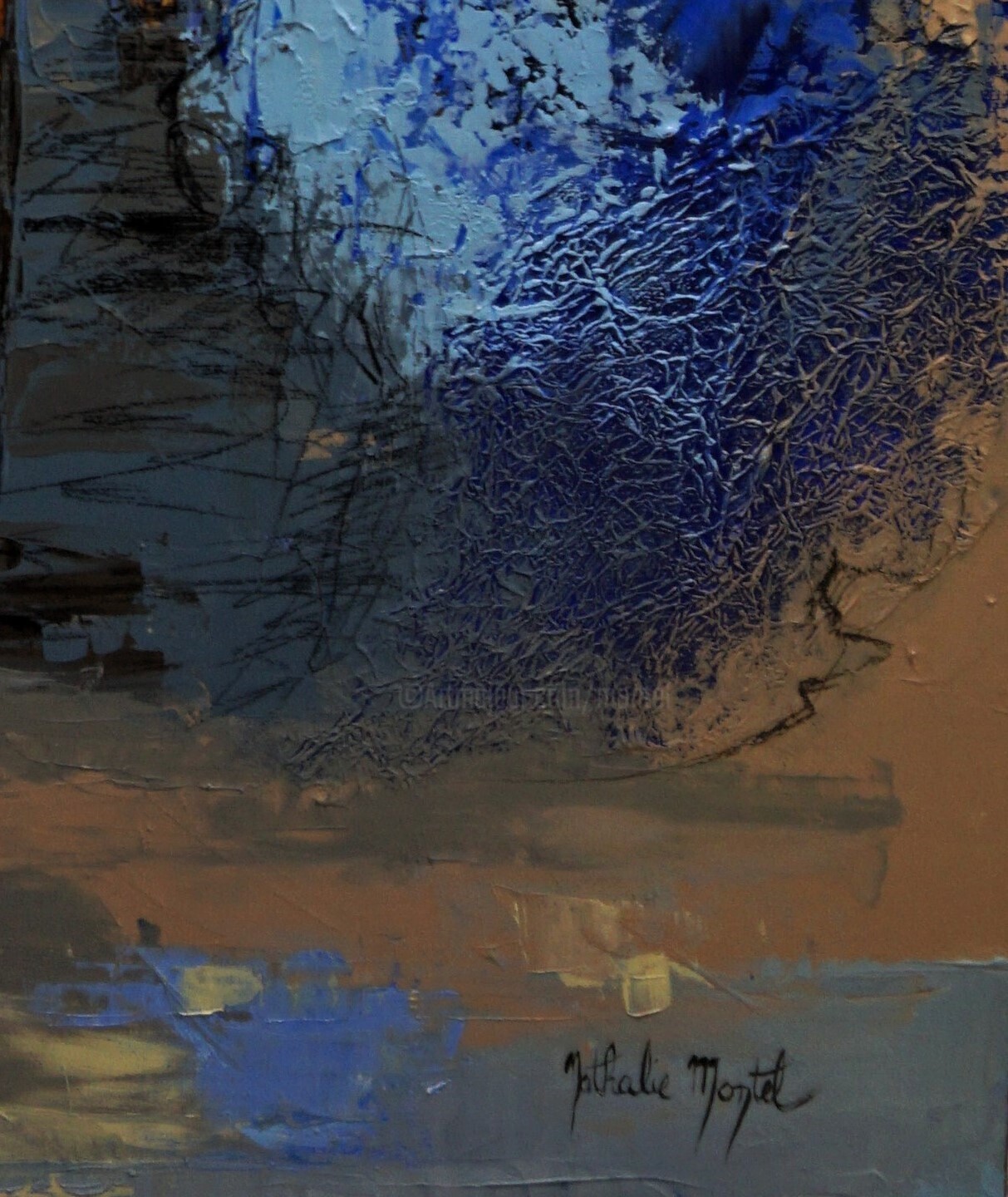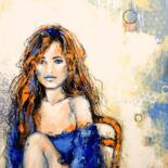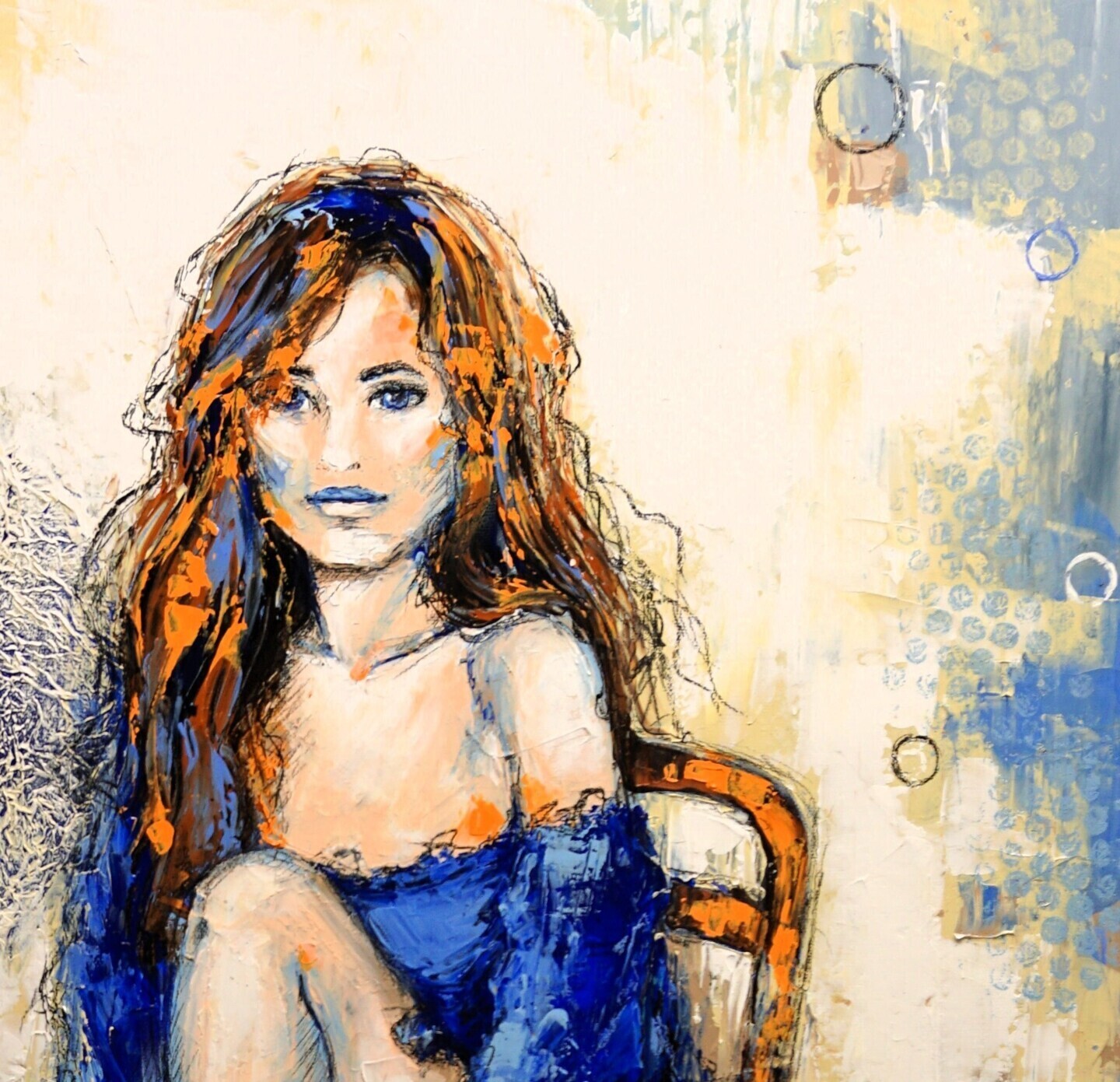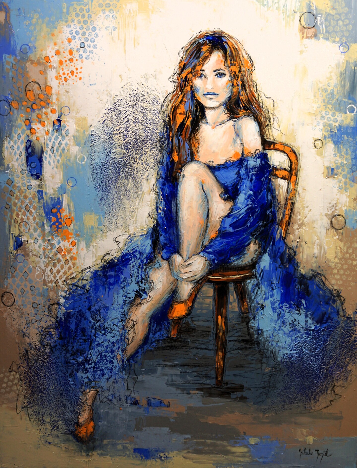 Une jeune femme assise sur une chaise dévoile ses jambes avec douceur et assurance. Quelques touches d'orangés réchauffent ce bleu électrique. Les graphismes et matières animent la surface de la toile.
